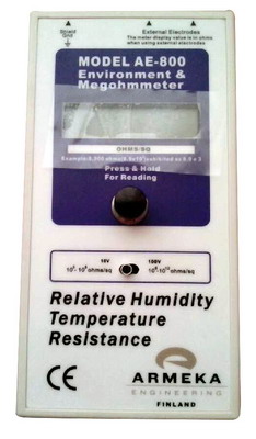 Features: The AE-800 Megohmmeter kit measures surface resistivity, resistance, temperature and humidity. It is designed to test conductive, anti-static, and static dissipative surfaces for electrical resistivity/resistance according to EOS/ESD, CECC, ANSI, ASTM and UL test procedures. The internal parallel electrodes comply with DIN EN 100 015/1 & ANSI/ESDA-S11.11. The five pound electrodes can be externally connected for tests according to IEC 61340-4-1, ANSI/ESDA S4.1 & ANSI/ESDA S7.1. Specifications: Resistivity: 103 ~1012 ohms/sq Resistance: 103 ~1012 ohms Relative Humidity: 10% - 90% RH Temperature: 32ºF ~ 100ºF or 0ºC ~ 37.7ºC if Celsius model was purchased Measuring voltage: 10v and 100v |
