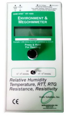 Features: The RT-1000 Resistance, resistivity ,temperature, humidity Test kit is easy to operate, compact, lightweight, portable meter designed to measure temperature, humidity and electrical resistivity/resistance. Using both internal and external test probes, the meter will measure resistivity, resistance to ground, resistance between two points according to EOS/ ESD association standards- S4.1, S6.1, S7.1, S11.11 and European standard CECC-EN 1000/15. With the accessory probes the meter can test the electrical circuitry of the building, ESD chairs, and smocks. Additional probes are available to measure heel straps, wrist straps, and small parts using miniature probes, and a concentric ring probe. Specifications: 1. Resistivity Test Ranges: 1 x 103 – 9 x 106 ohms @10volts; 1 x 106 – 9 x 1012 ohms @100 volts 2. Dimensions: 7.50 inch (19.05cm)L x 4.00 inch (10.16 cm) W x 1.5 inch (3.81cm) H. 3. Current Limit: 1 milliamp DC current for 10 volts; 0.1 milliamp DC current for 100 volts. 4. Accuracy: 103~108 ohms +/-10%; 109~1010 ohms +/-15%; 1011~1012 ohms +/-25% 5. Zero: Automatic zeroing 6. Operating Conditions: 32°F-100°F (0~38°C) |