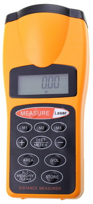 1. Range: 0.91m to 15m 2. Accuracy: +/-0.5% 3. Laser beam: 1mW 4. Wavelength: 650nm 5. With laser point aiming 6. Foot/Meter function button 7. LCD screen on a luminous background 8. Auto stop: switches off if you do not press any key for 4 min. 9. Memory: allows you to measure and to store 3 different measures 10.Calculation of area and volume. 11.Addition and Subtraction function: allows you to add or subtract 2 measures. 12.Clearing of memory function: allow you to delete quickly all the measures stored. 13.Correction of errors: the distance measurer indicates that a distance measured is either too long, or too short. 14.Power supply: 1 x 9V Battery (Not included) 15.Frequency: 40 kHz (ultrasonic pickup) 16.Working temperature: 0oC ~ 43oC 17.Dimensions: 142 x 73 x 47mm 18.Weight (without battery): 144.6g |